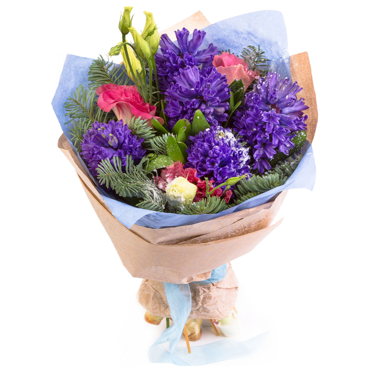 Гиацинт фиолетовый, эутома белая и розовая, пихта. Упаковка (лента, пленка, крафт, сетка, пленка матовая)