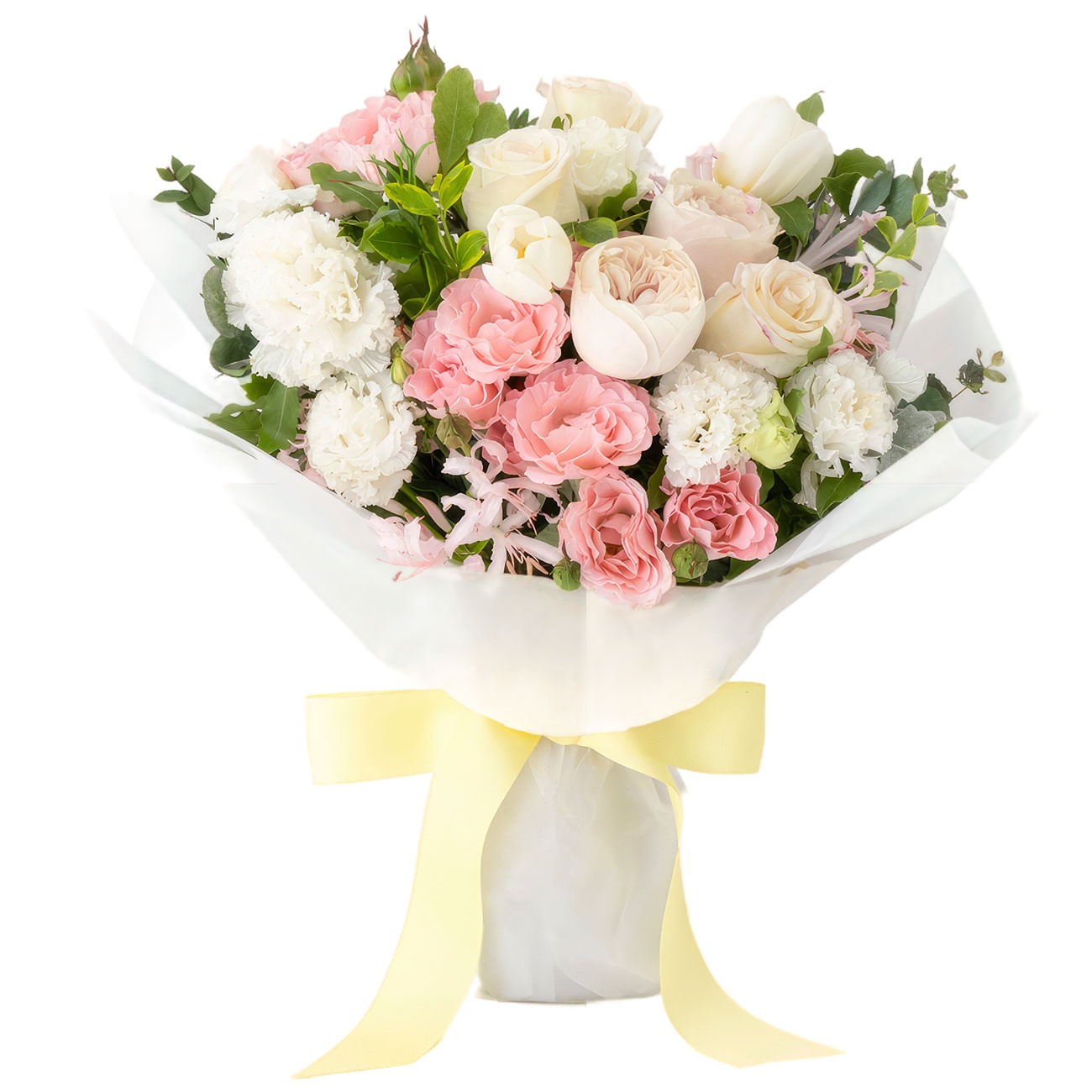 Роза пионовидная белая, роза одноголовая белая, тюльпан белый, роза кустовая розовая, эустома белая, салал, эвкалипт. Упаковка (лента, пленка, крафт, сетка, пленка матовая)