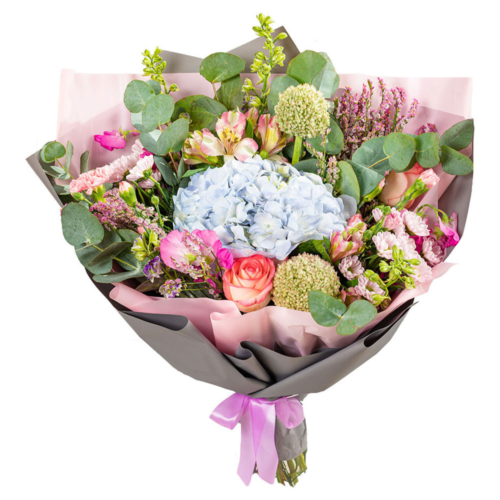 | Состав | Альстромерии, Гортензии, Розы, Хризантемы, Эвкалипт |