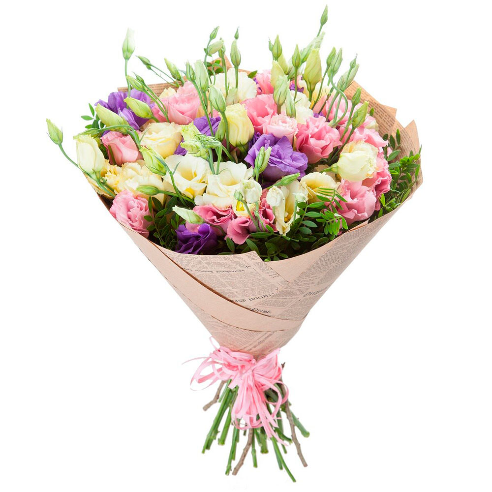Лизиантус микс (белый, розовый, сиреневый), фисташка. Упаковка (лента, пленка, крафт, сетка, пленка матовая)