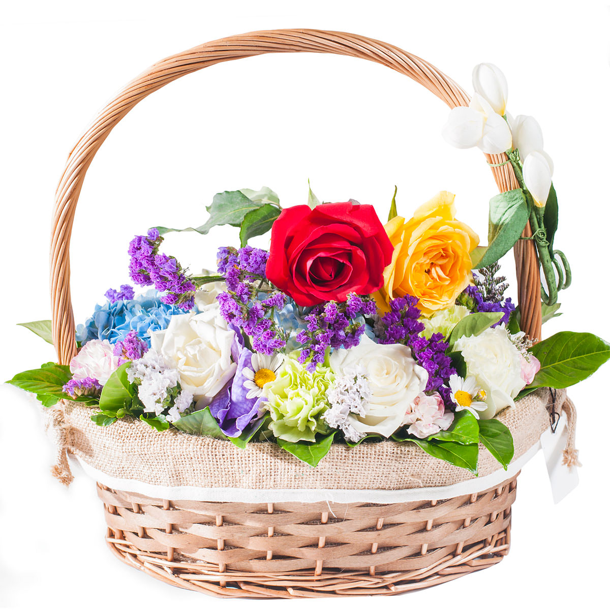 Роза одноголовая красная, белая и желтая, гортензия голубая, ромашка, гвоздика желтая, статица. Упаковка (Корзина, оазис, ящик).
