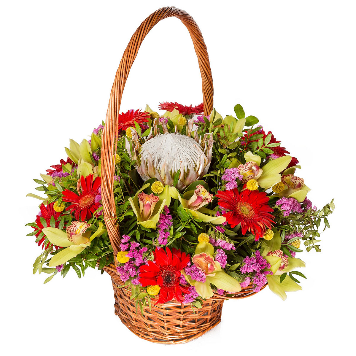 Орхидея желтая, гербера оранжевая, протея артишоковая, статица розовая, фисташка. Упаковка (Корзина, оазис, ящик).
