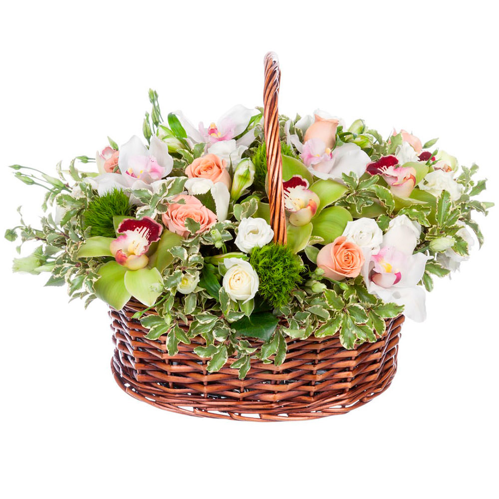 Роза микс (белая, персиковая), орхидея микс (белая, зеленая), питтоспорум, гвоздика. Упаковка (Корзина, оазис).